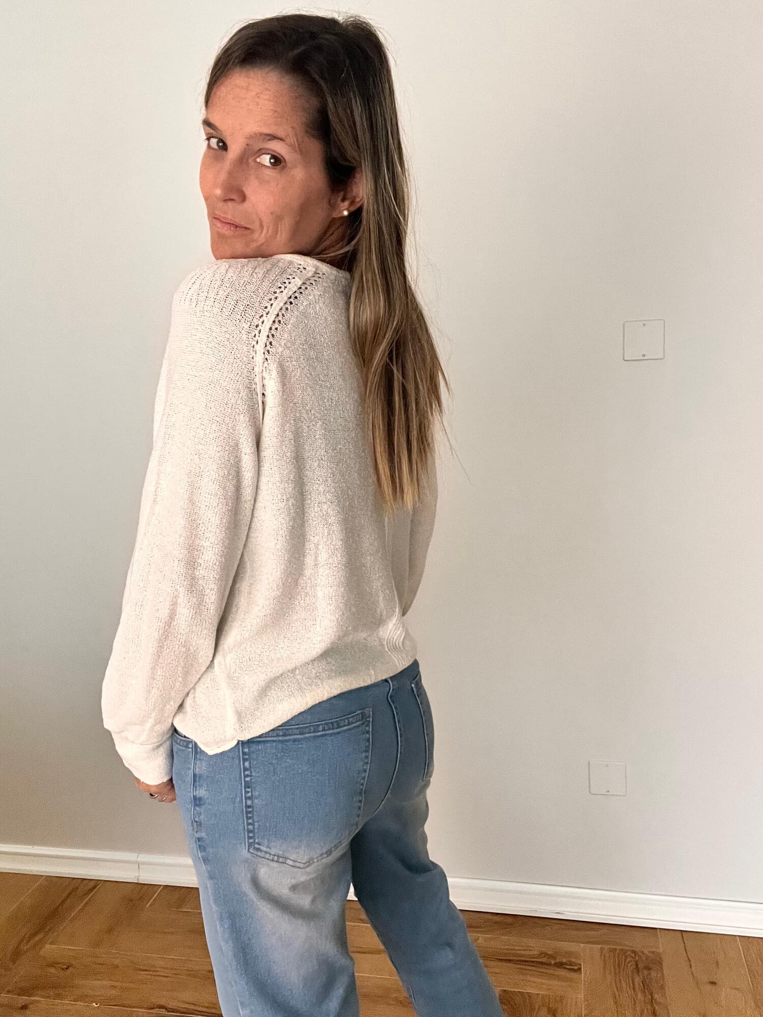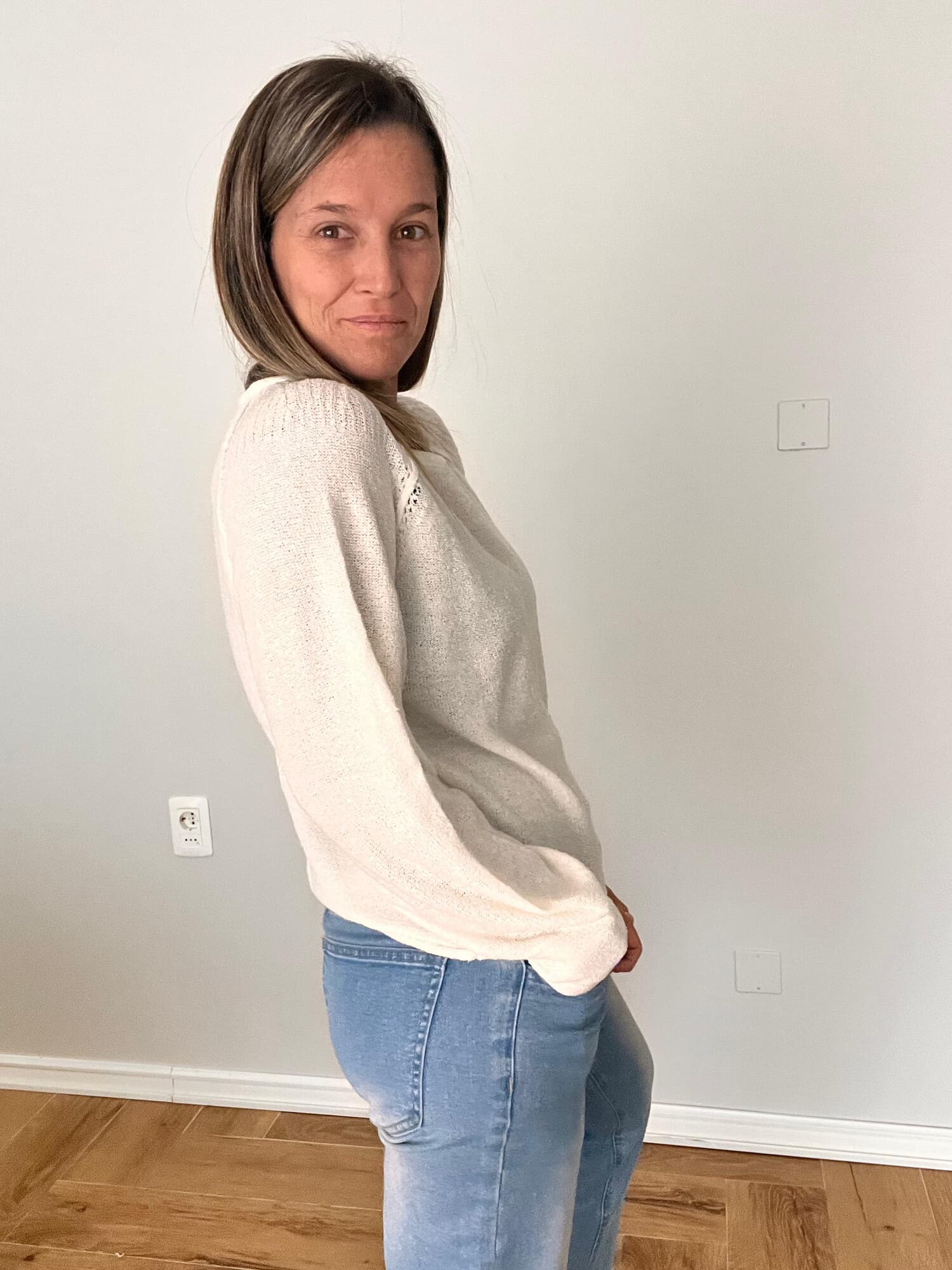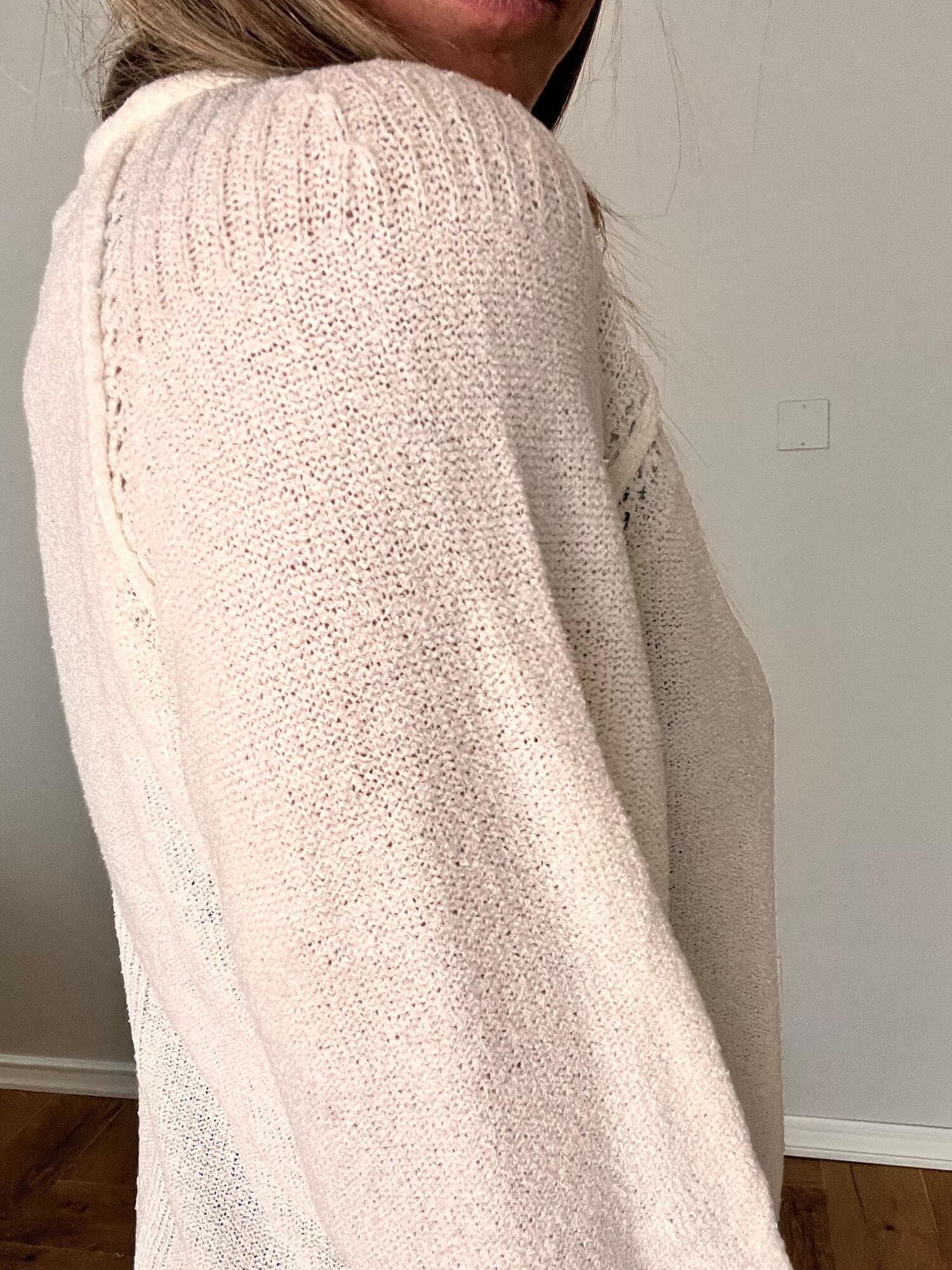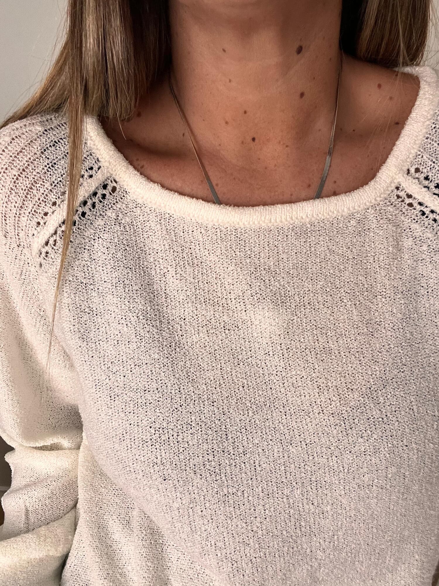 Un básico versátil y delicado que no puede faltar en tu guardarropa. Tejido en punto liviano y suave, con detalle calado en los hombros que aporta un toque femenino y distinguido. Su calce relajado y mangas levemente abullonadas lo hacen ideal para usar tanto de día como de noche.