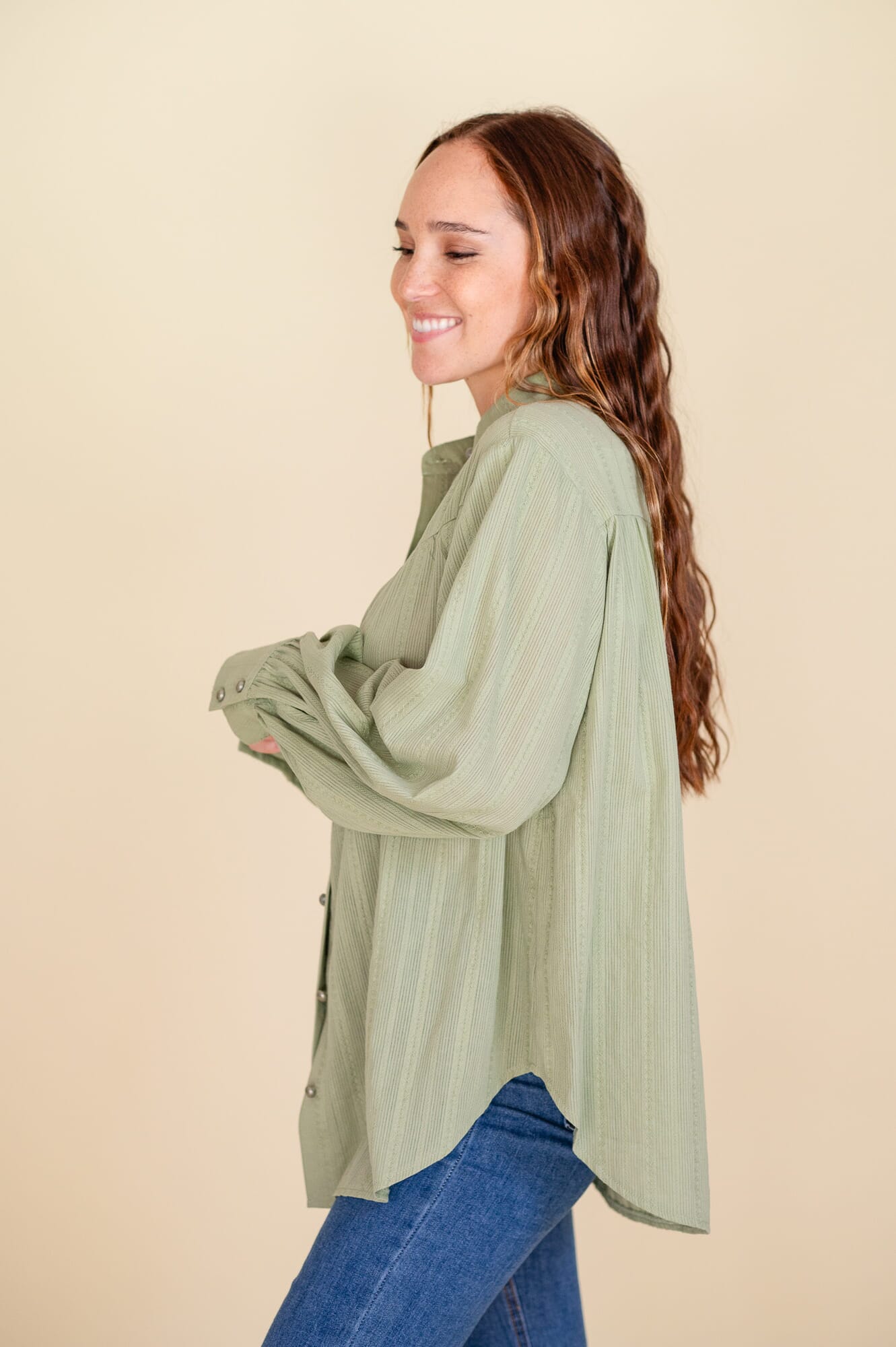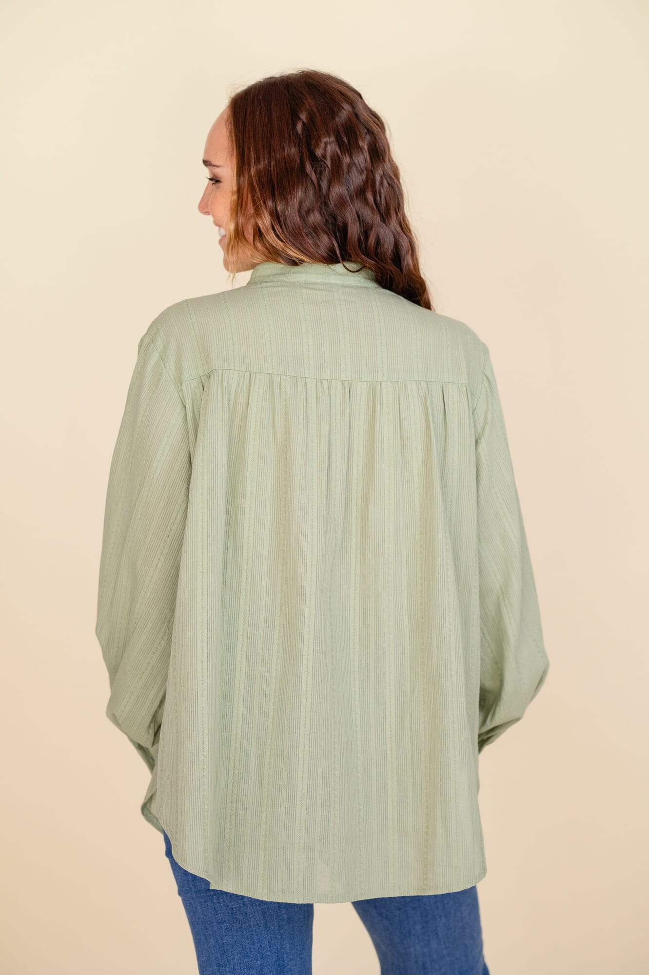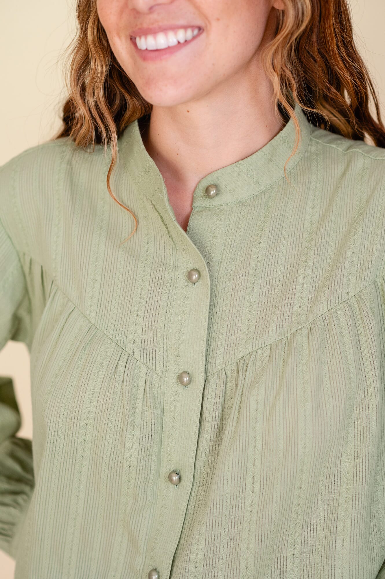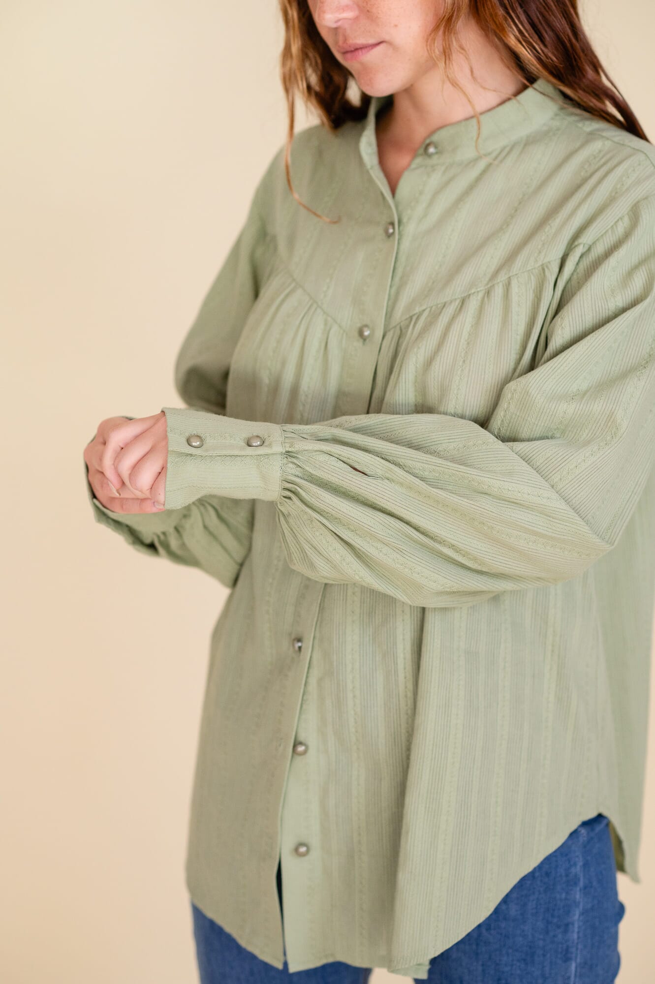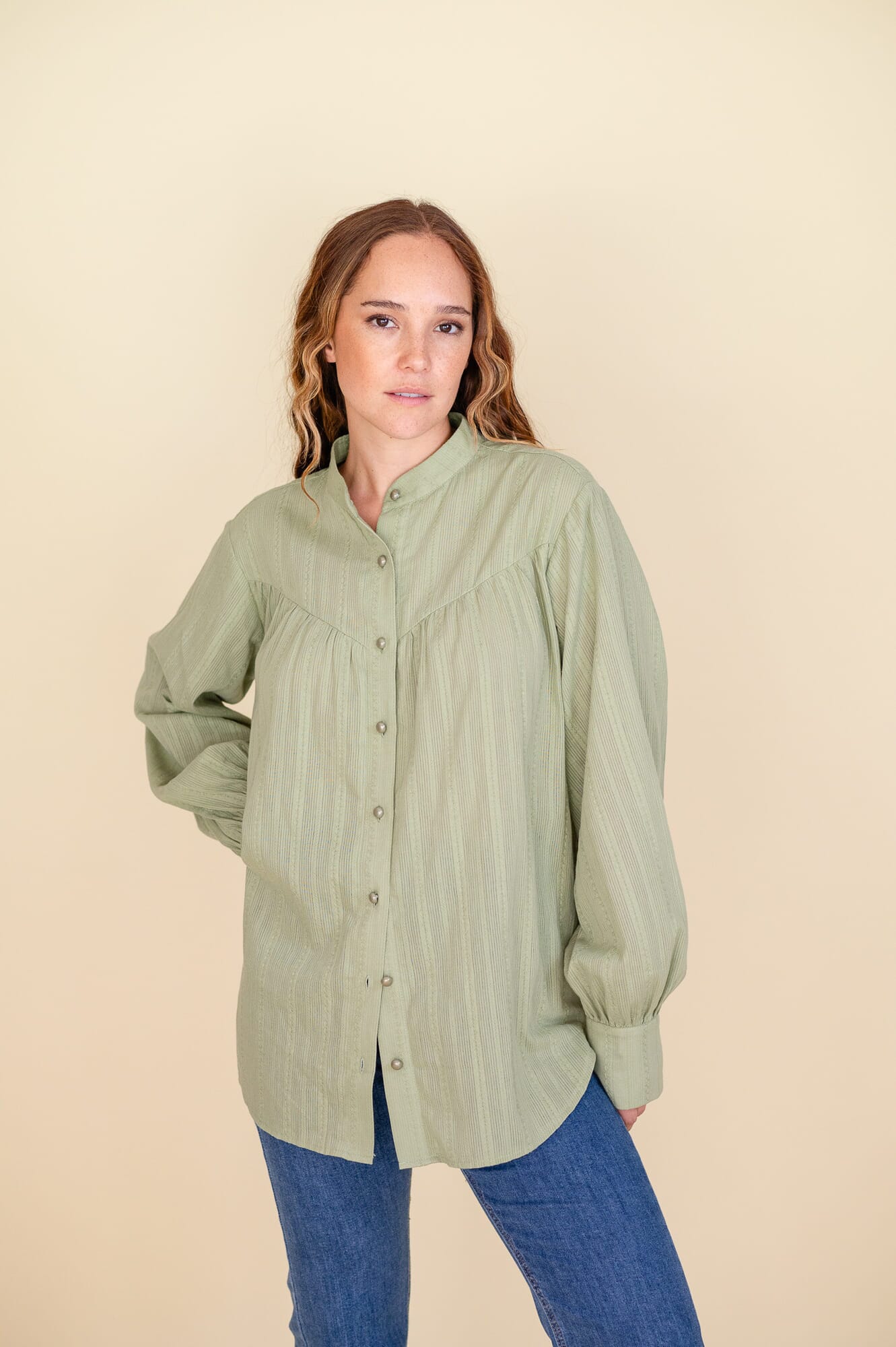 Camisa amplia, cuello mao, Corte en v a la altura del pecho. Botones cromados a tono con la camisa. Doble botón en puño.