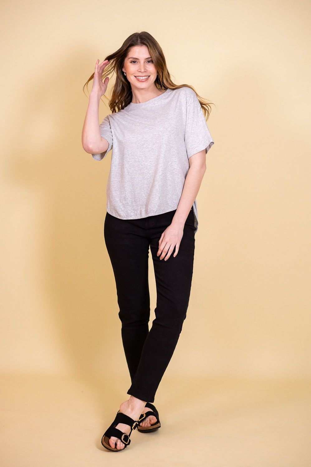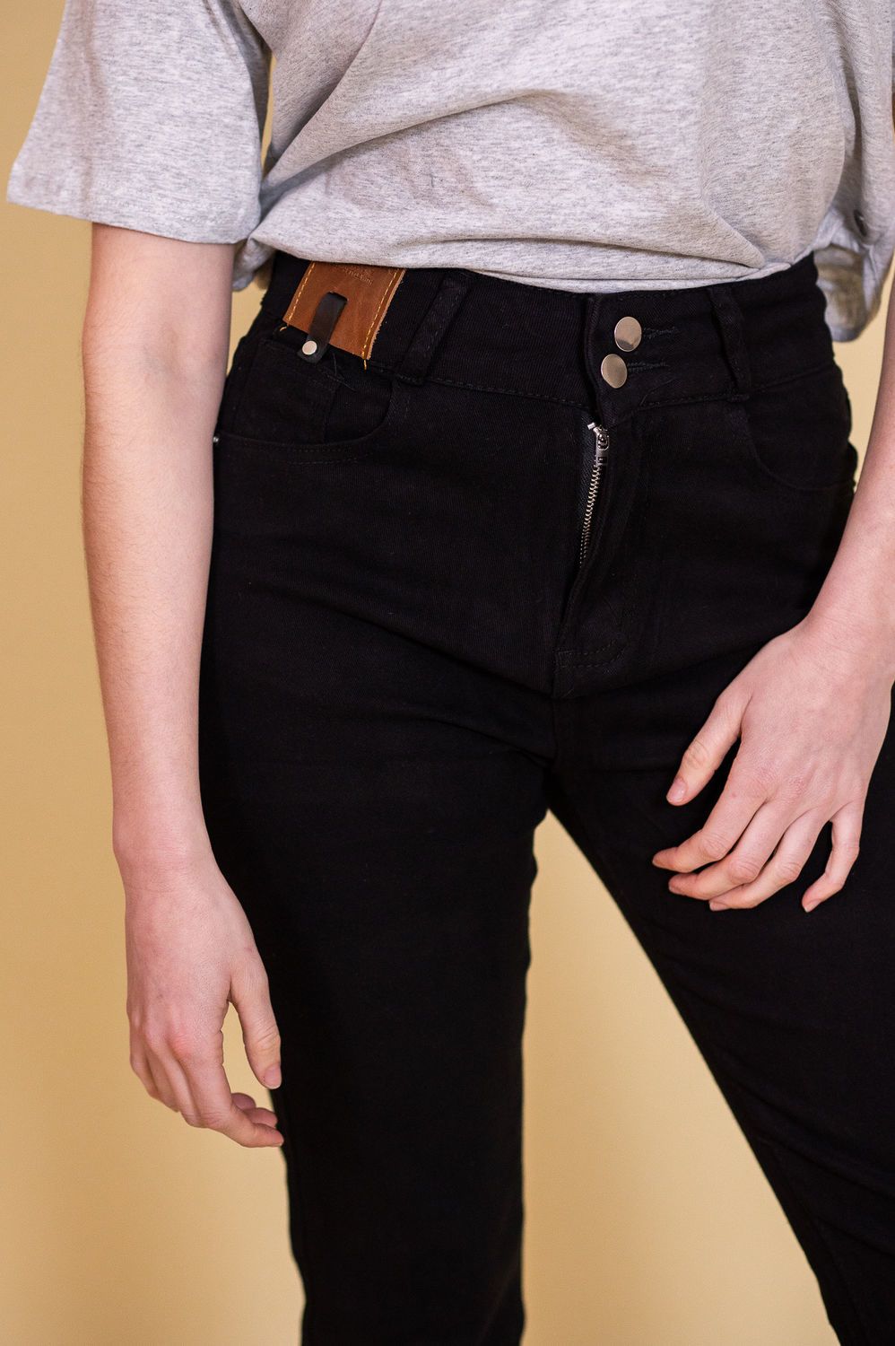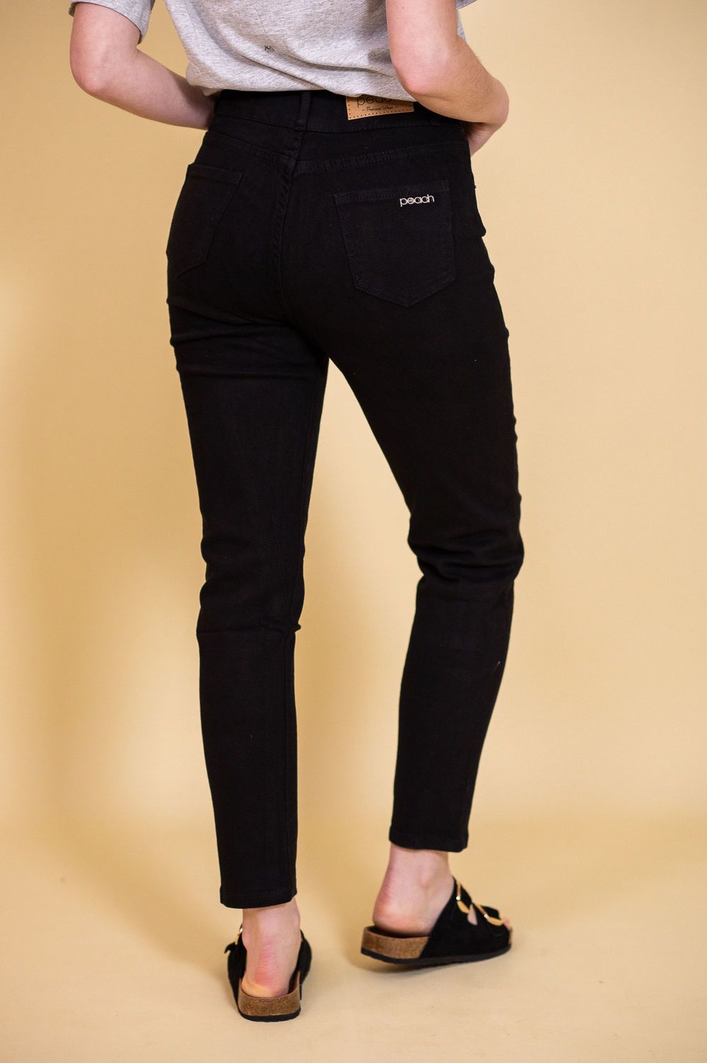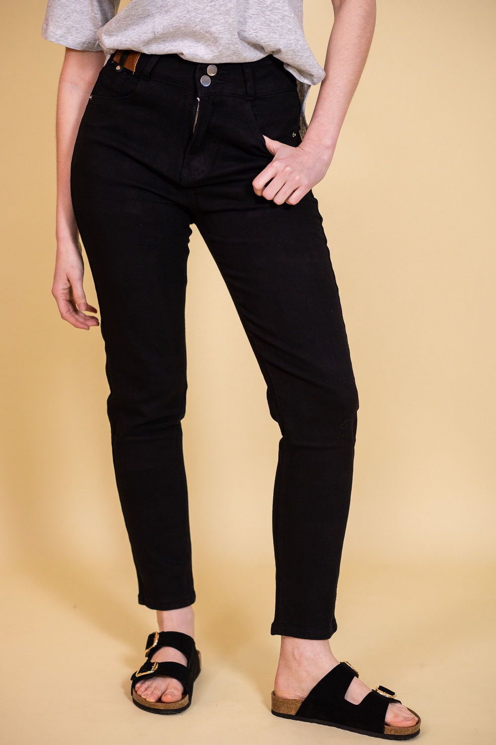 Jean de tiro alto. 5 bolsillos. Tela con mucho elastano. Cierre frontal con doble botón y cierre metálico.