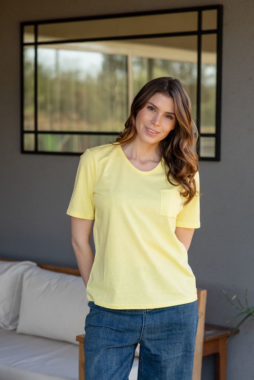 Remera básica de algodón muy suave al tacto. Escote redondo y detalle de bolsillo en uno de los costados